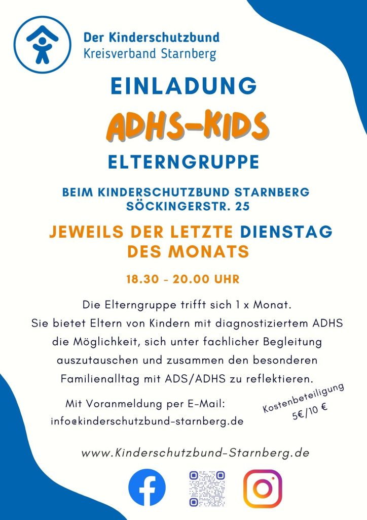 Die Gruppe trifft sich in einem kleinen Rahmen, wir bitten daher unbedingt um eine Voranmeldung per E-Mail an unser Büro (info@kinderschutzbund-starnberg.de) mit der Information zum Alter der Kinder und der Information seit wann die Diagnose ADHS/ADS besteht.