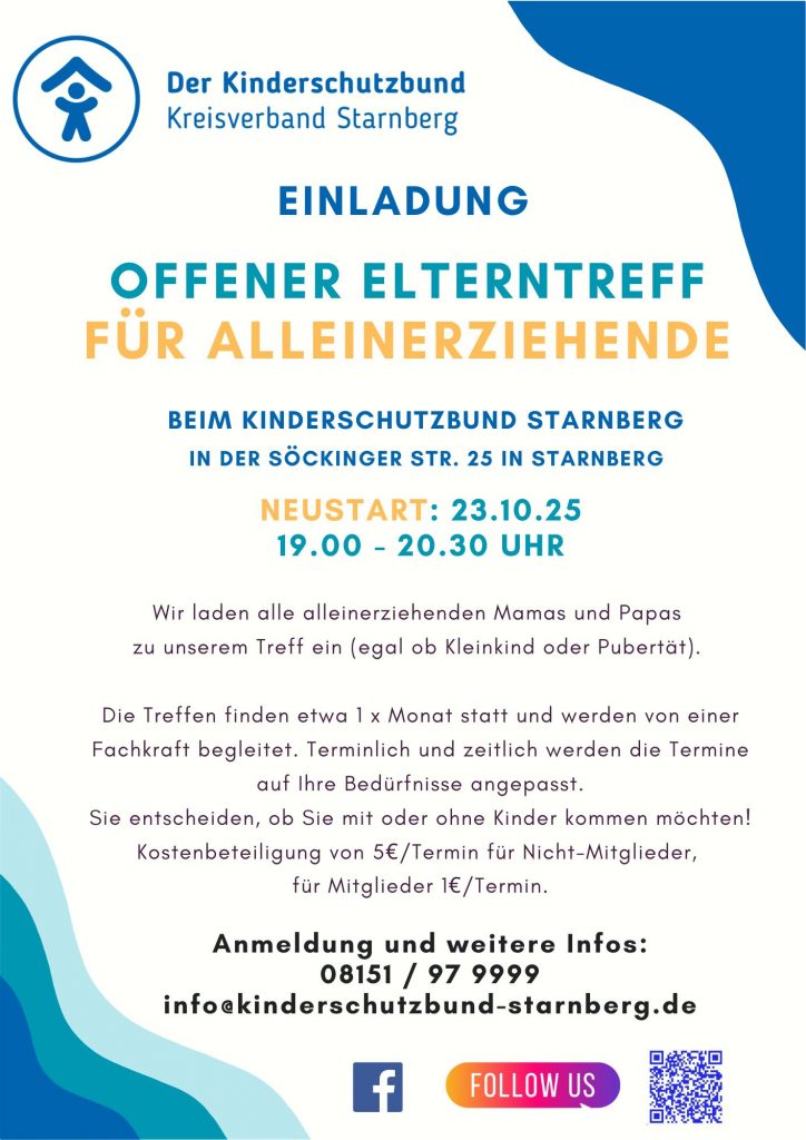 Das erste Treffen findet am Donnerstag, dem 23. Oktober von 19.00 bis 20.30 Uhr in den Räumen des Kinderschutzbundes, Söckinger Straße 25 in Starnberg, statt. Der Elterntreff richtet sich an alle Alleinerziehenden – unabhängig davon, ob Ihre Kinder noch klein sind oder bereits in der Pubertät. Auch Schwangere in Trennung sind willkommen.